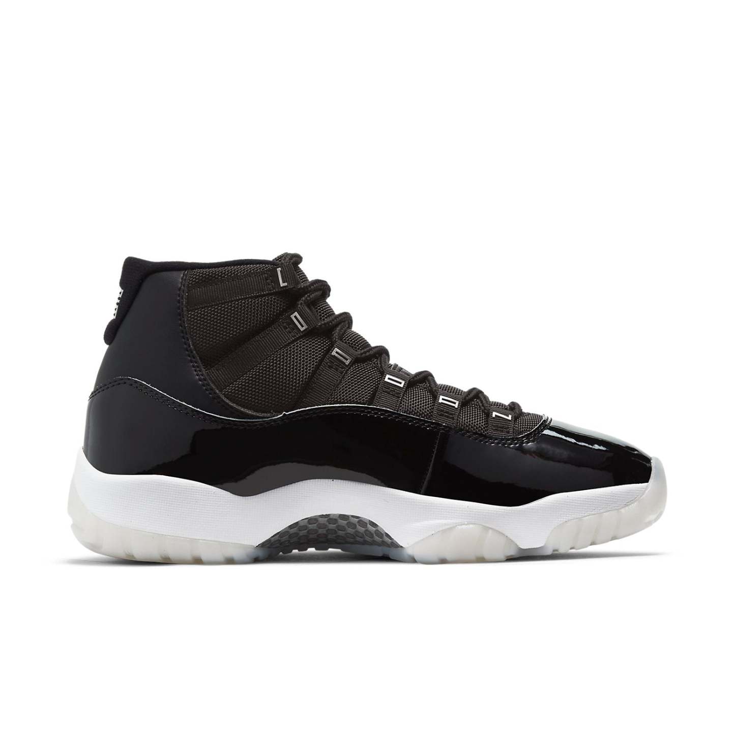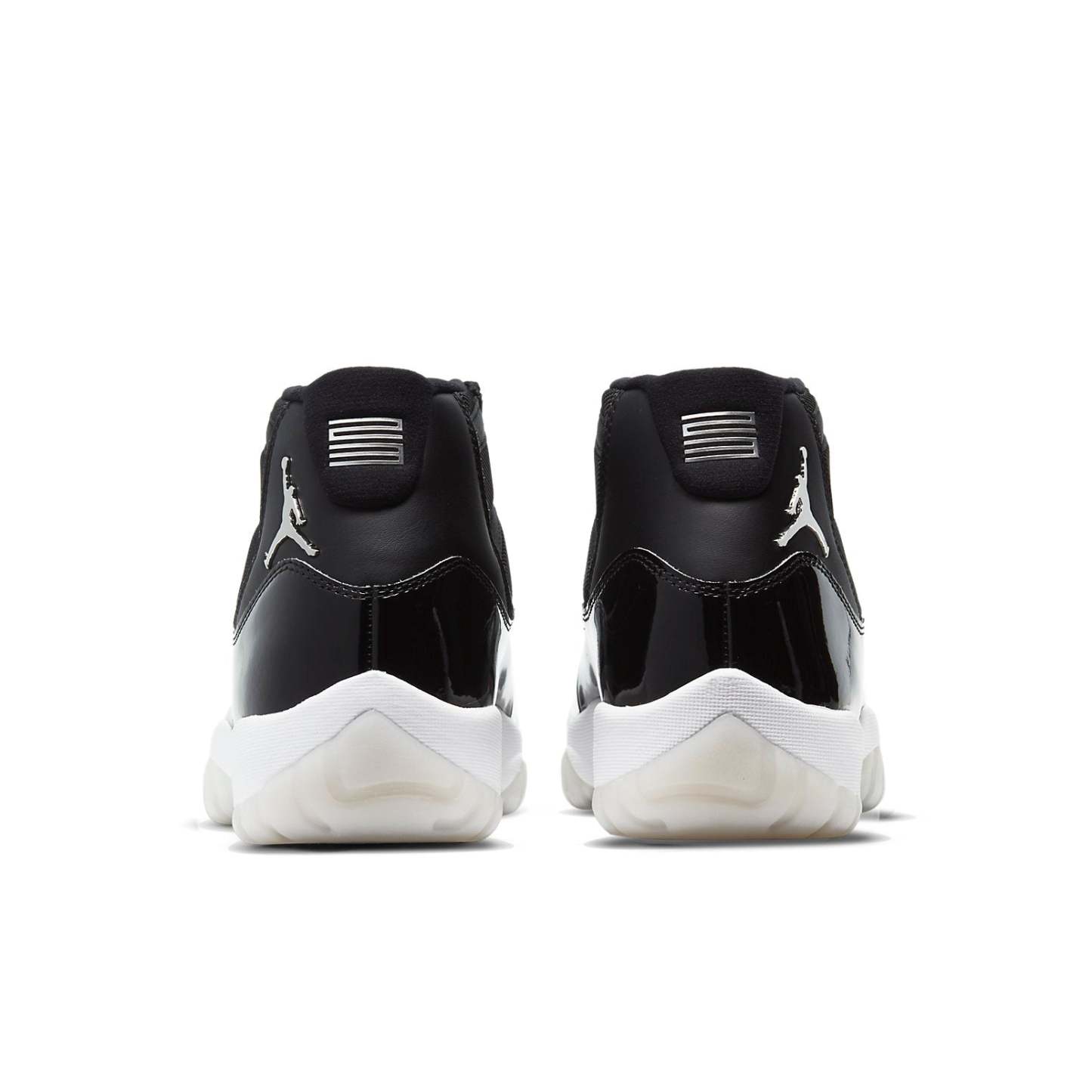 Nike Air Jordan 11 Retro “Jubilee 25th Anniversary ” dressed in Black, Sliver color scheme with a metallic silver Jumpman. The JORDAN on the eyelets and the classic glossy patent leather in piano black.