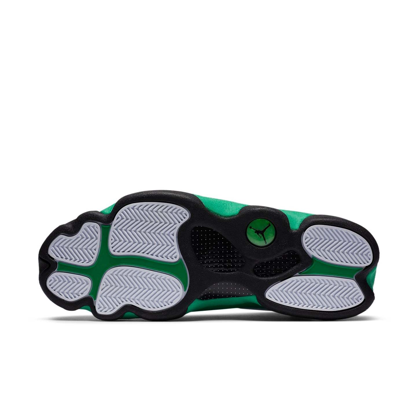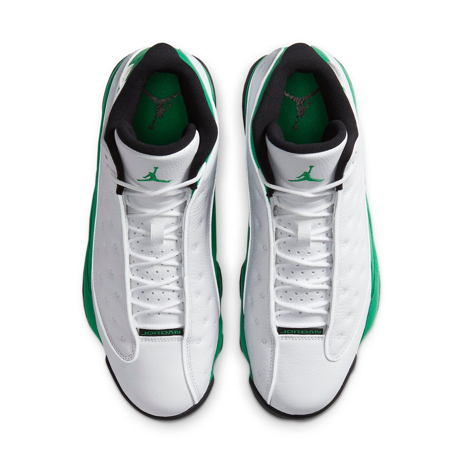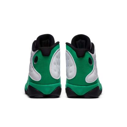 The Air Jordan 13 Retro 'Lucky Green' is a beautiful sneaker that takes design cues from Ray Allen's Air 'Three-Point Record' PE from 2011. The upper is crafted from white tumbled leather and green synthetic suede, supported by the signature panther paw outsole in black rubber. The green Jumpman embroidery on the tongue and the matching hologram on the lateral ankle add pops of color and branding to this stylish sneaker.