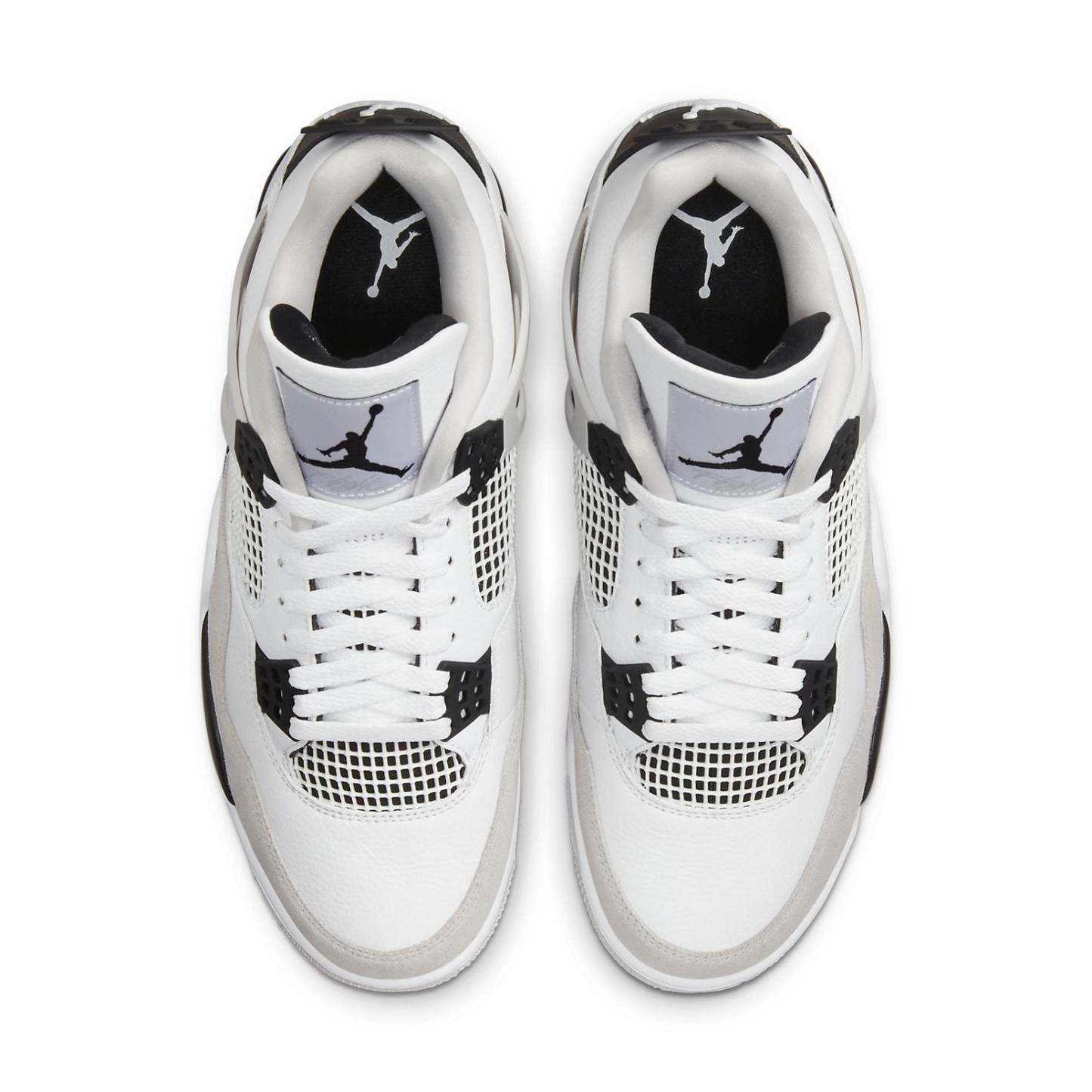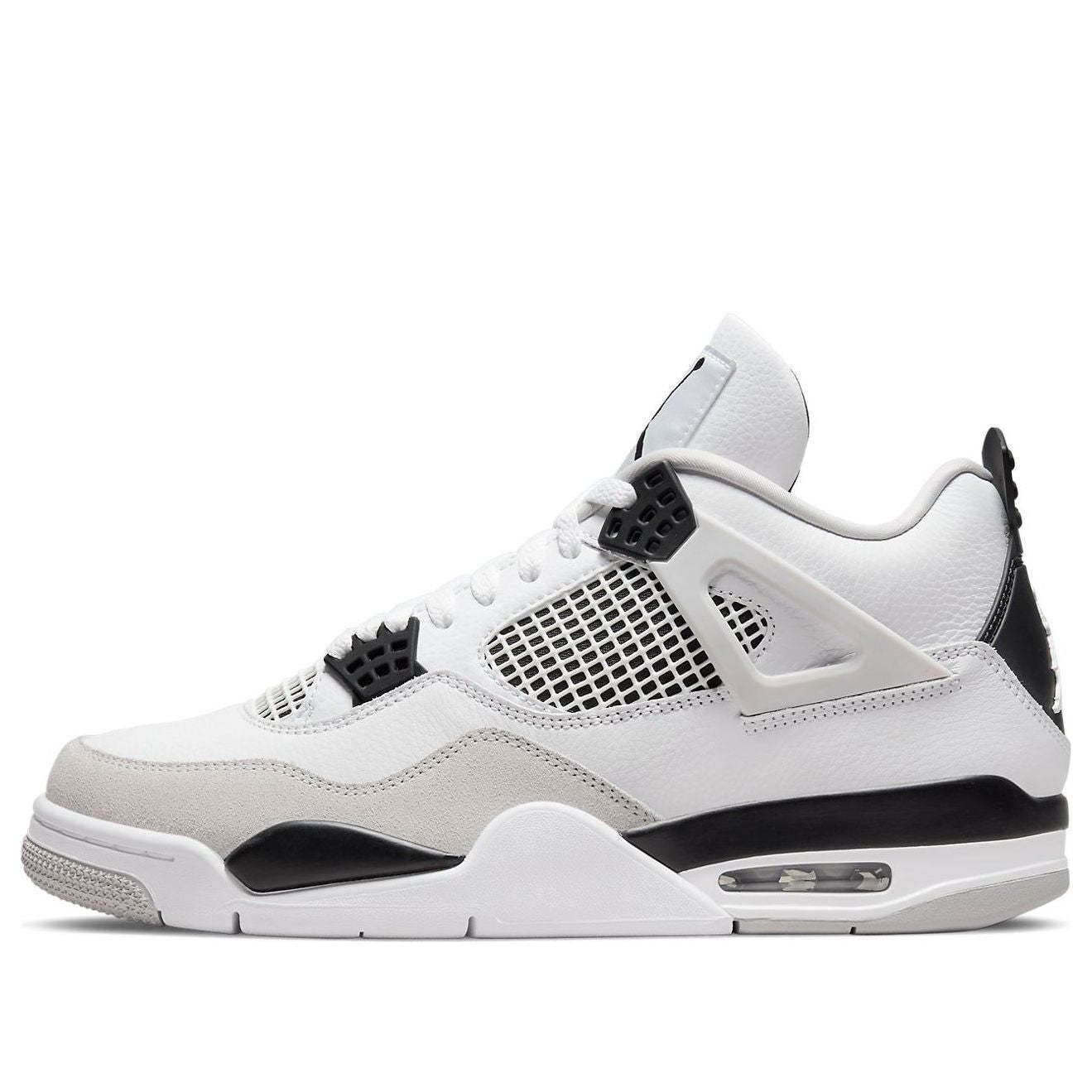 Treat your feet to a piece of sneaker royalty with the Air Jordan 4 Retro 'Military Black.' This iconic footwear piece is shaped in the silhouette of one of Jordan Brand's original designs - the Air Jordan 4 Military Blue. Crafted from premium materials, this stylish pair features a smooth white leather upper, which is complemented by a light grey Durabuck toe wrap, and netted TPU inserts for breathability and functionality. To add a pop of color, the Military Black eyelets, heel tabs, and underlays provide vibrant contrast to the upper. At the base sits a comfortable unit sole featuring fashionable colors: white, black, and light grey. Get ready to stand out and hit refresh on your wardrobe with these statement sneakers that pay homage to shoes worn by basketball legend Michael Jordan.