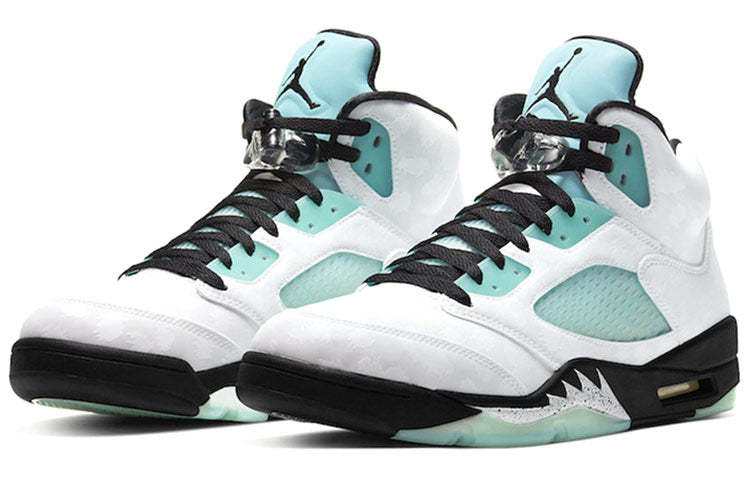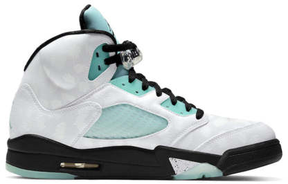 The Nike Air Jordan 5 Retro model gets a chilly "Island Green" makeover. The leopard print upper comes in white, while the mesh, tongue and eyestay are in Island Green. Black laces and detailing tie the upper together, underneath is a black midsole with shark teeth detailing and a semi-translucent coat in Island Green.