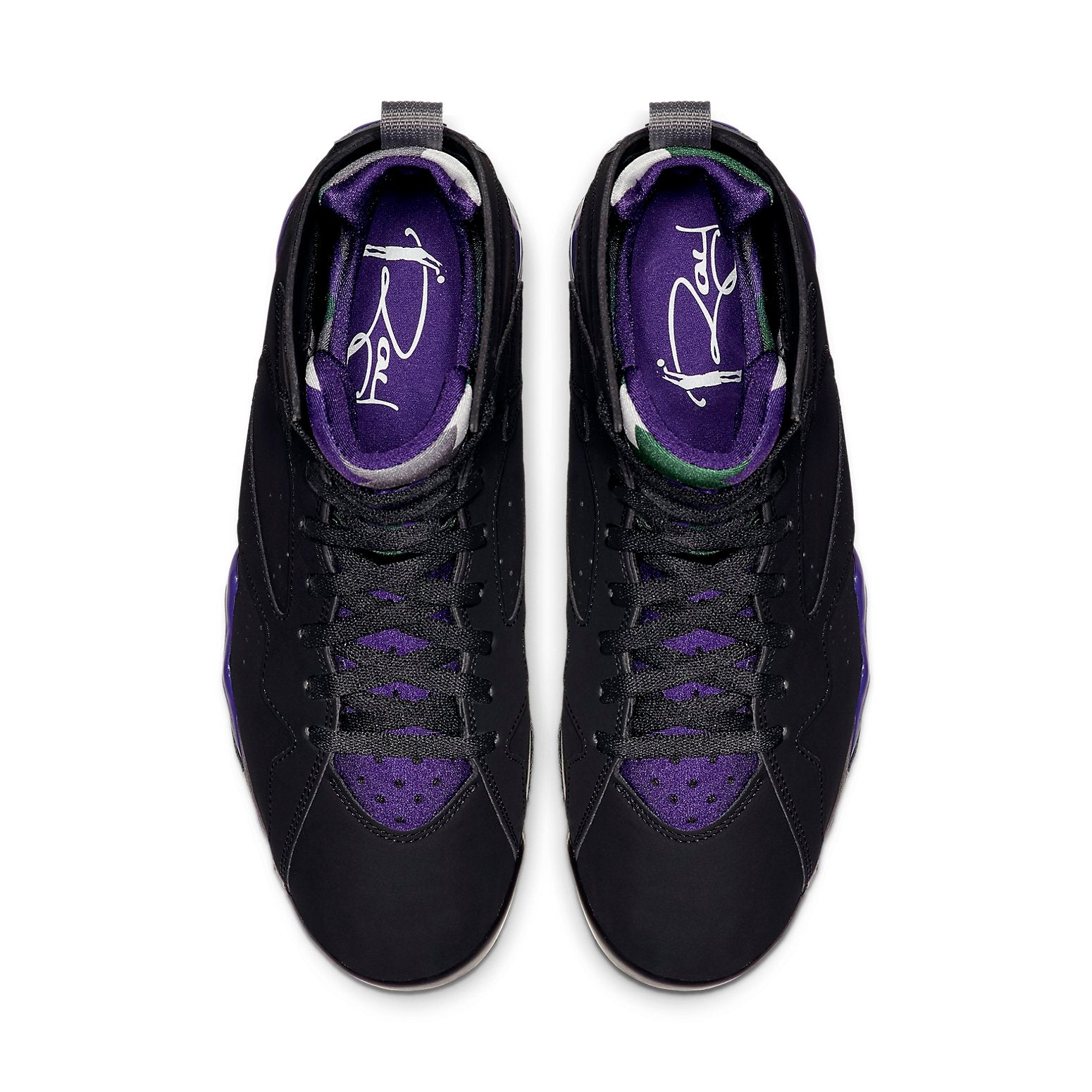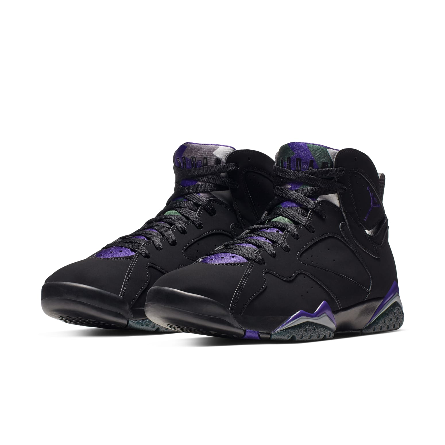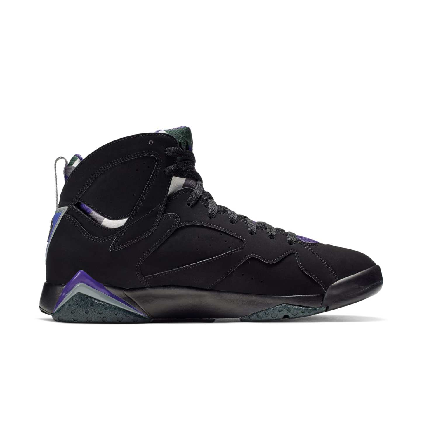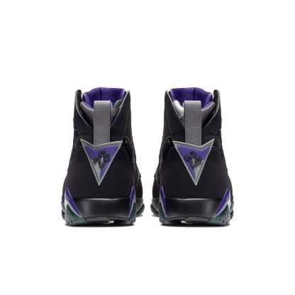 The Air Jordan 7 Retro 'Bucks Away' celebrates one of the most iconic moments in MJ's career. In his second season with the Chicago Bulls, MJ hit a game-winning shot over Bryon Russell and the Utah Jazz to give the Bulls their second three-peat. This shoe features a black upper with a smooth nubuck application and purple and silver accents on the midsole, outsole, and tongue.