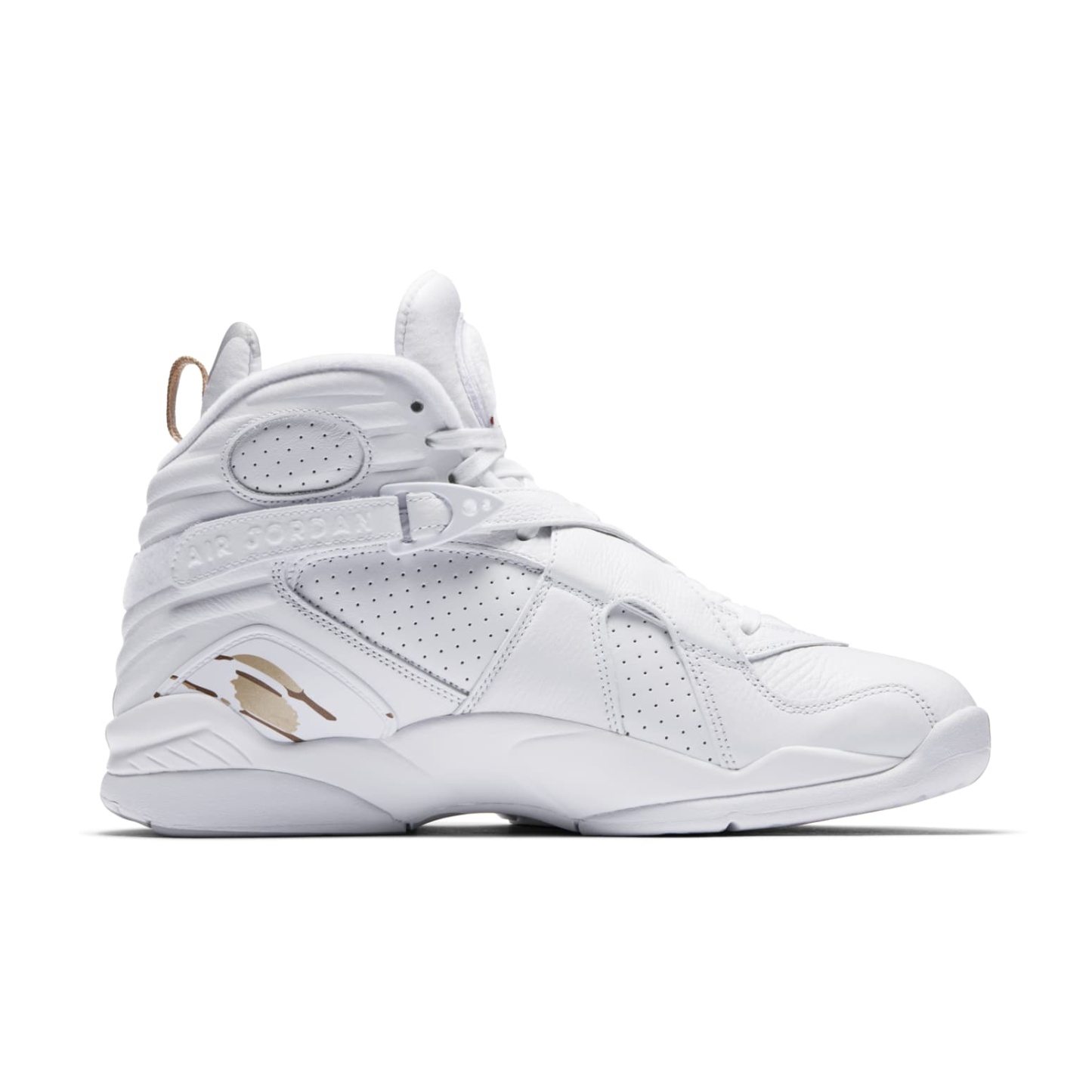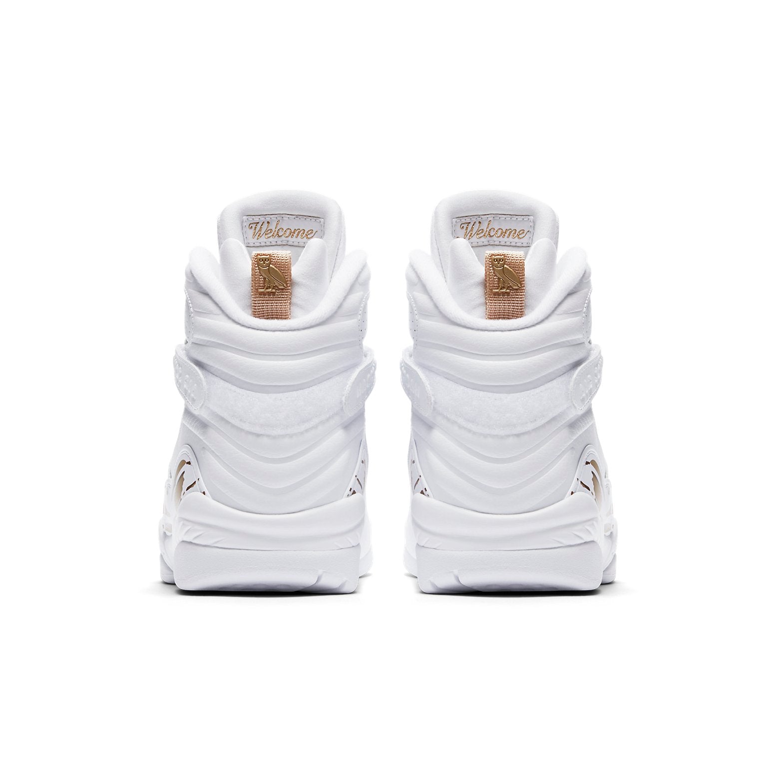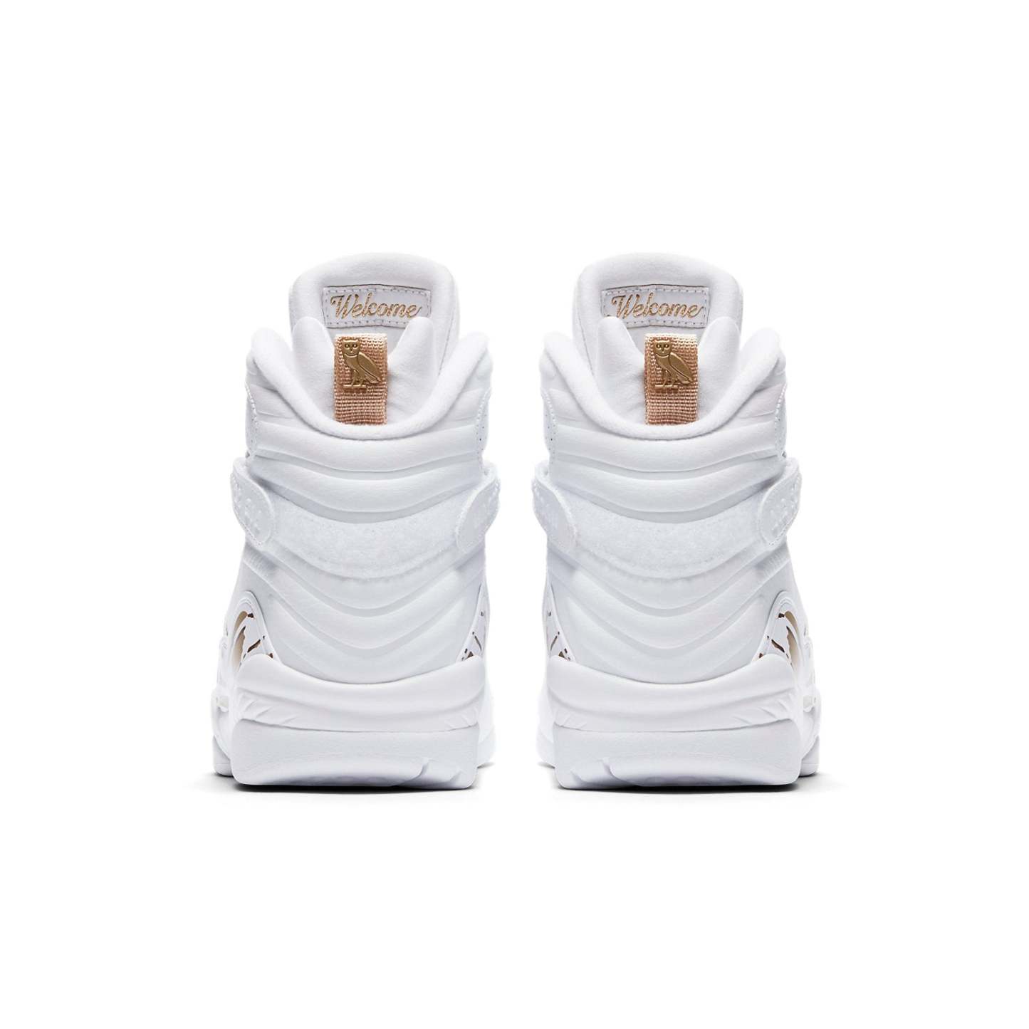 The Jordan Brand and world-renowned hip-hop artist Drake have teamed up to create a one-of-a-kind shoe in honor of the NBA All-Star weekend. The OVO x Air Jordan 8 Retro 'White' is a work of art, featuring black suede and tumbled leather upper with red accents on the Jumpman logo at the tongue, metallic gold accents on the toe box, heel pull tabs, and on a paintbrush-stroke pattern at the midfoot. The high top also boasts a strap across the ankle, a black rubber midsole, and OVO branding and owls throughout. This shoe is perfect for Drake fans and Air Jordan enthusiasts alike.