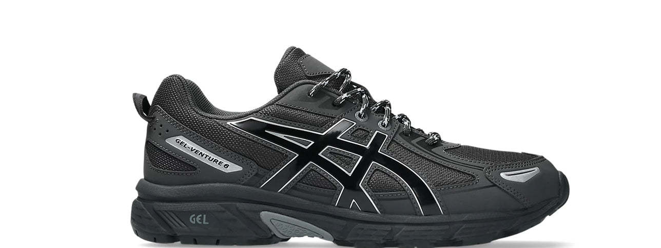 Trail inspired. Built for the streets. These men's GEL-VENTURE 6 sneakers from ASICS are for exploring the city. They feature a padded collar for support. Pull-tab for easy access. And a breathable yet durable layered upper. Underfoot, rearfoot GEL tech offers a smooth step. Grippy rubber to the outsole brings firm traction. Landing in dark grey with black and silver, it's signed off with signature ASICS branding.