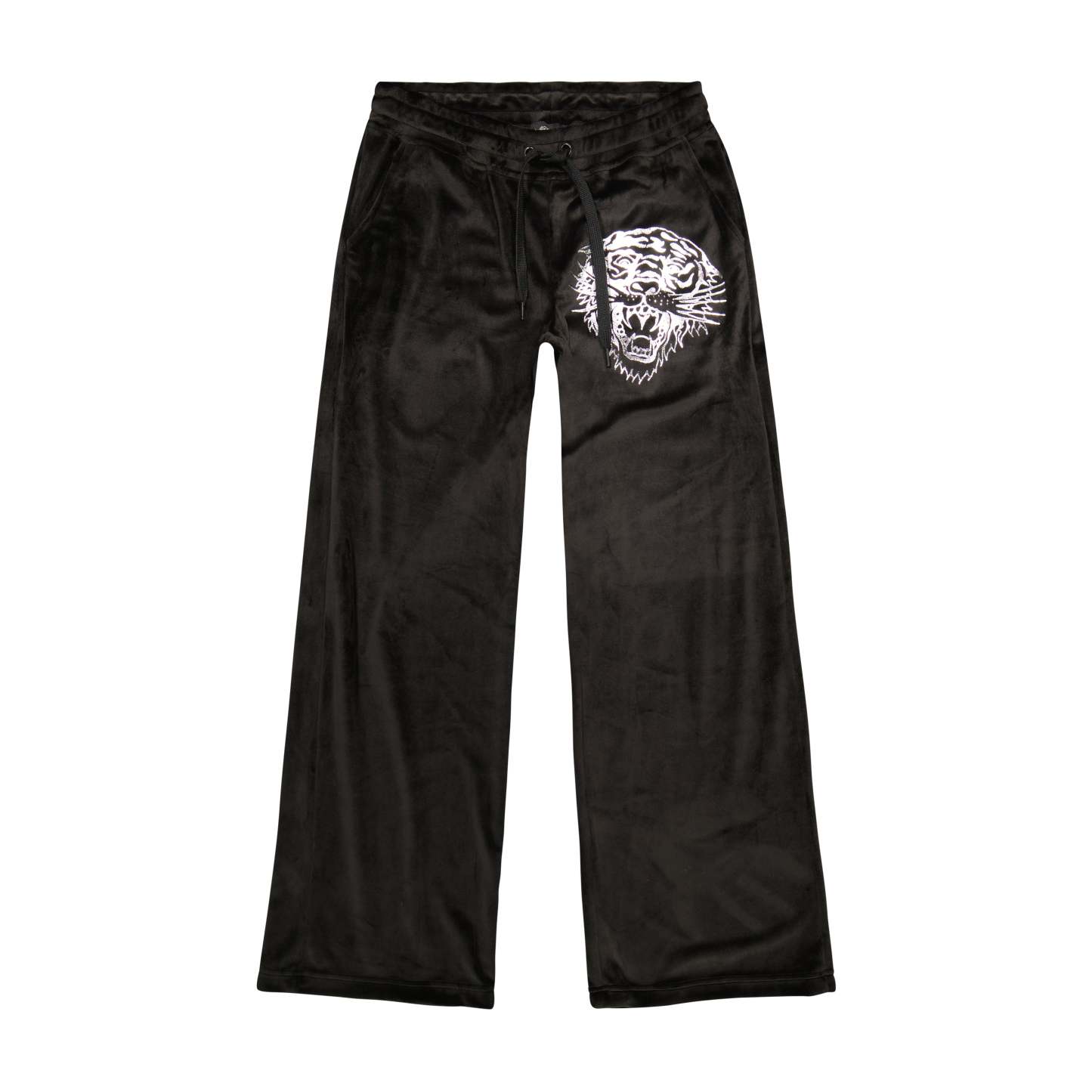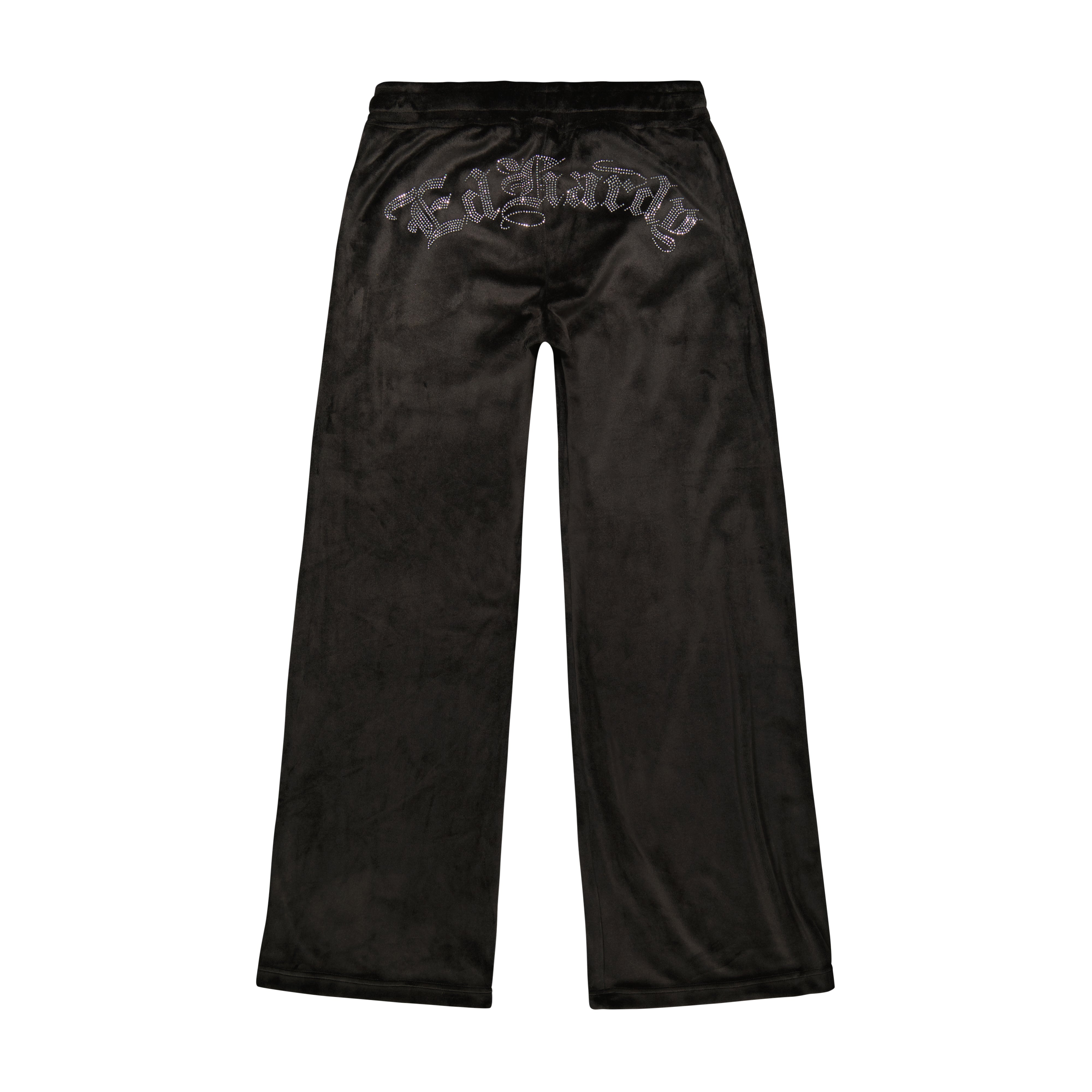 Ed Hardy’s velour sets are a modern twist on the iconic style that reigned in the early 2000’s. These wide leg black velour sweatpants mesh comfort and style, featuring a foil tiger head decal and a silver rhinestone old english logo.