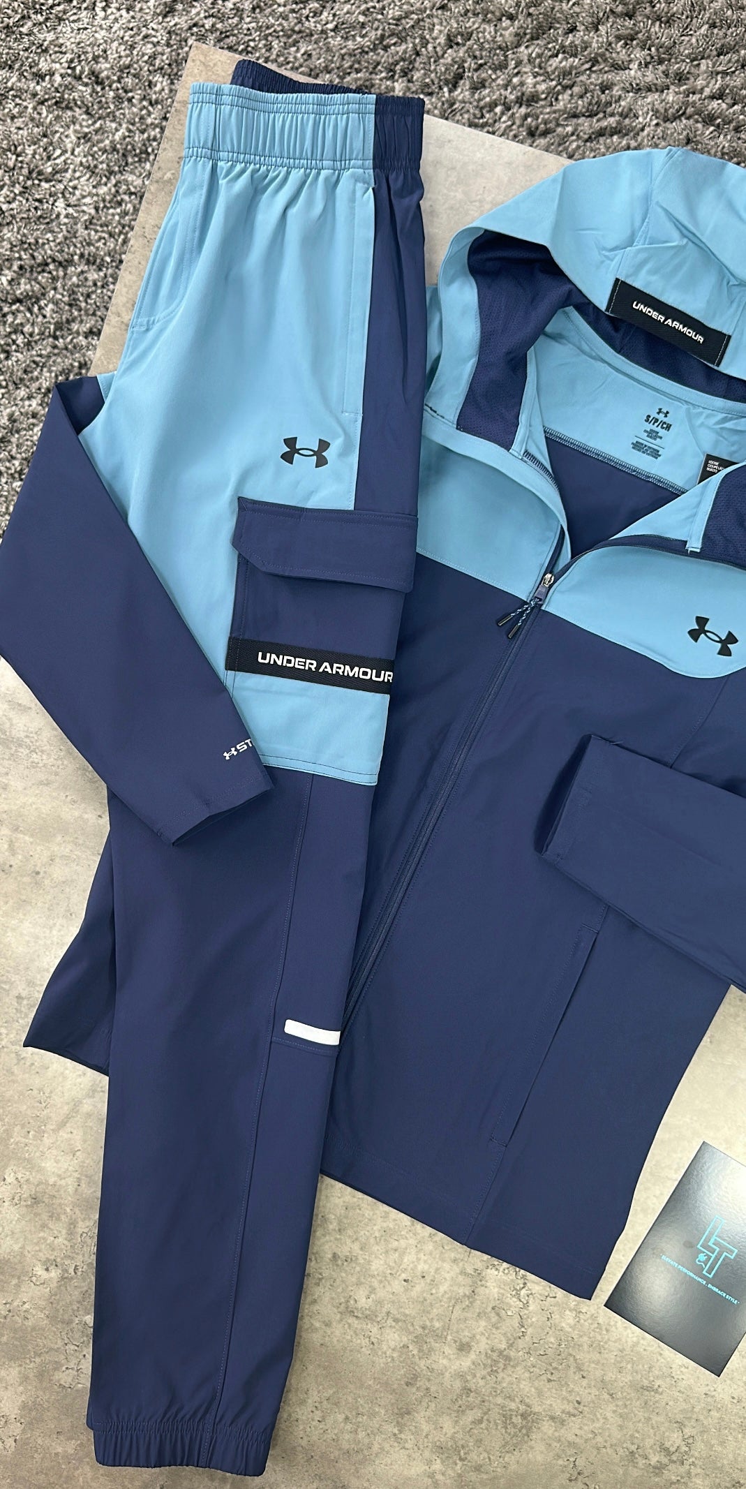 The UNDER ARMOUR TECH UTILITY TRACKSUIT in blue is engineered for superior performance and comfort. Featuring UA Storm technology, it repels water while maintaining breathability. Its lightweight stretch-woven fabric offers durability and unrestricted movement through 4-way stretch material. Practical design elements include an encased elastic waistband with internal drawcord, secure zip hand pockets, a back pocket, flap-closure cargo pockets, and encased elastic cuffs for a secure fit. This track suit is ideal for active wearers seeking protection and versatility in all conditions.