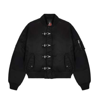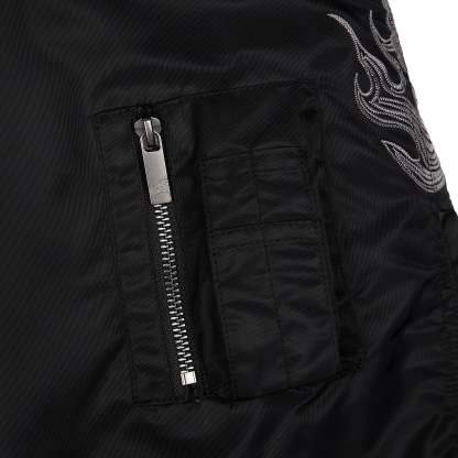 160gsm parachute fabric / 100% nylon / wind- and waterproof / polyester lining / fiber filling / ribbed collar, hem and cuffs / embroidery on back / with JKJ zipper and fireman claps / fits true to size