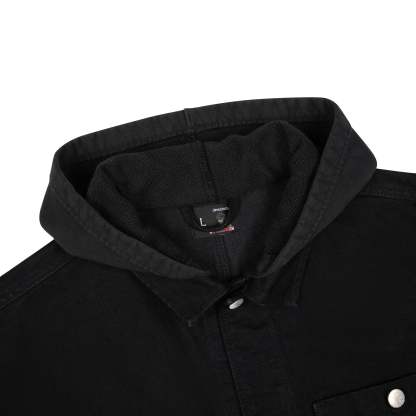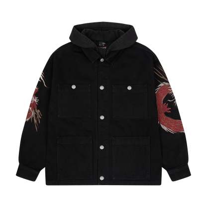 14oz denim / 460gsm brushed cotton hood / 100% cotton / embroidery on back and sleeves / pockets on front / custom buttons / fits true to size