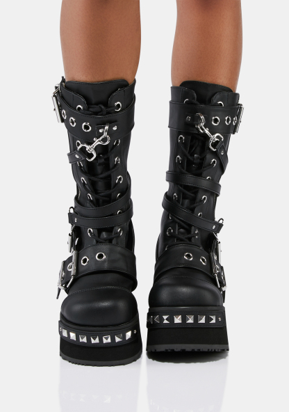 Oblivion Platform Buckle Boots have a vegan leather construction, metal plate details with studded trim, adjustable lace-ups, strappy eyelet buckle designs, and side zip closures.